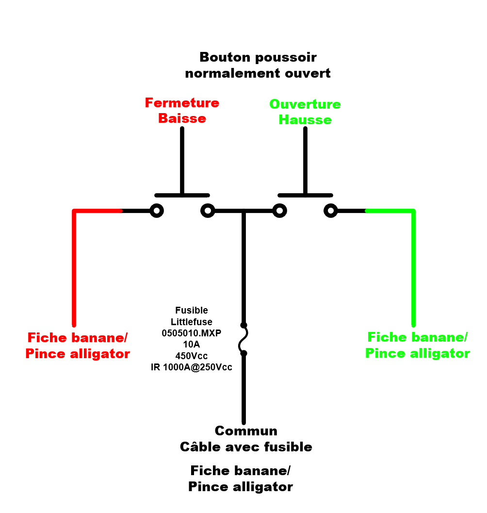 La configuration est NO entre le commun (noir) et le rouge et NO entre le commun (noir) et le vert.